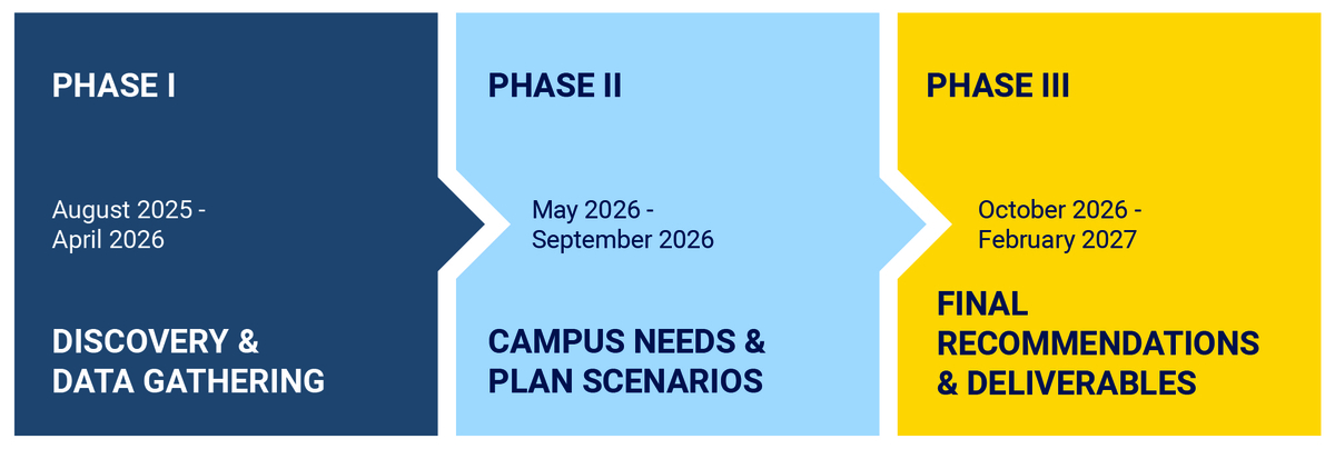 As the Comprehensive Campus Plan progresses over the next 18 months, we will periodically update the Timeline page with key highlights from each of the phases. Stay tuned!